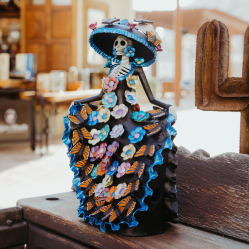 Formed from black clay and ceramic, each sculpture showcases the skill and cultural pride of Capula’s artisans. This Catrina, detailed with painted butterflies, symbolizes renewal and remembrance—capturing life’s cycles in a form that’s both elegant and meaningful. A piece that honors heritage and artistry, it’s designed to be celebrated for generations.